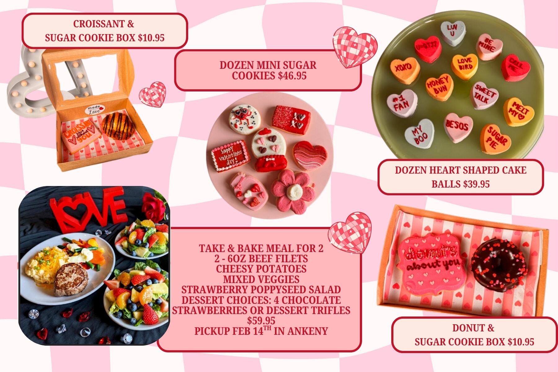 If you want to wow your Valentine without stressing over reservations or cooking, Main Street Cafe & Bakery has you covered. They’re offering adorable Valentine’s treats and a cozy take-and-bake meal for two — all available to order online and pick up in Ankeny.